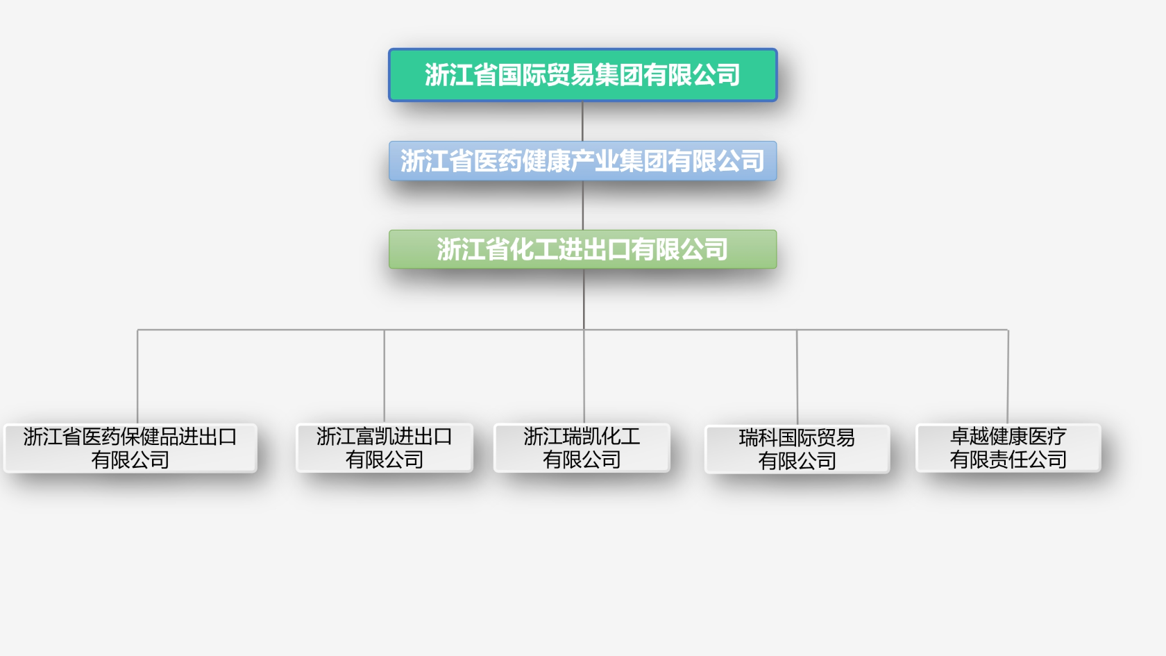 公司注册资本1.29亿元人民币,共有员工320余人,下设综合办公室、党委组织部(人力资源部)、财务部等7个职能部室和17个业务部门,拥有浙江省医药保健品进出口有限责任公司、浙江瑞凯化工有限公司、浙江富凯进出口有限公司、瑞科国际贸易有限公司(香港)、卓越医疗健康有限责任公司(印度尼西亚)等境内外全资子公司9家,驻越南办事处1个,并参股经营浙江奥托康制药股份有限公司(持股比例10%)。
